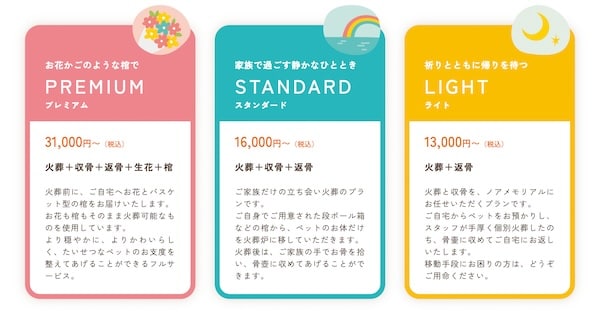 いずれもペットの大きさに応じた価格設定で、料金には骨壺と骨袋が含まれる。