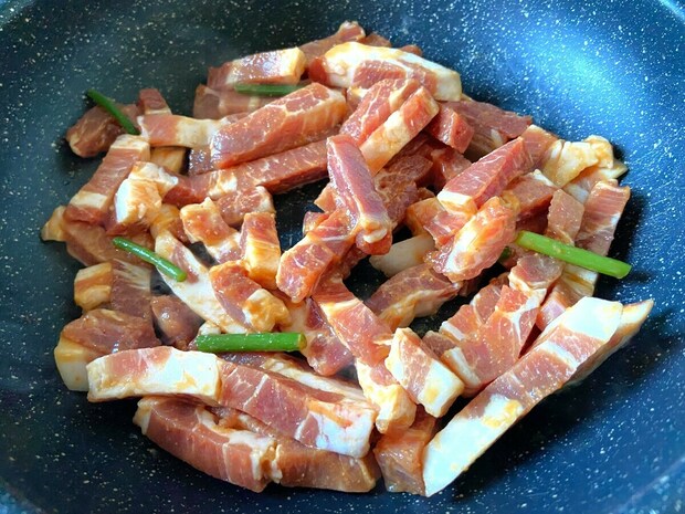 豚肩ロース肉が食べやすいスティック状にカットされていて味がついたパック。
