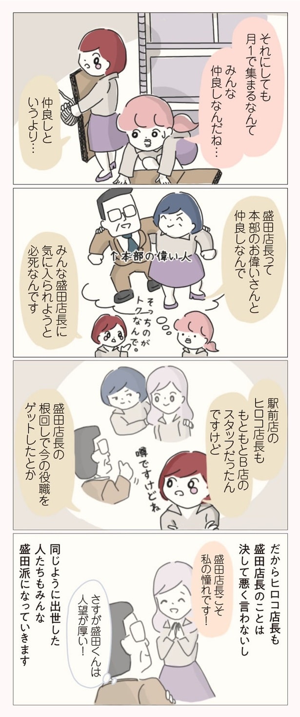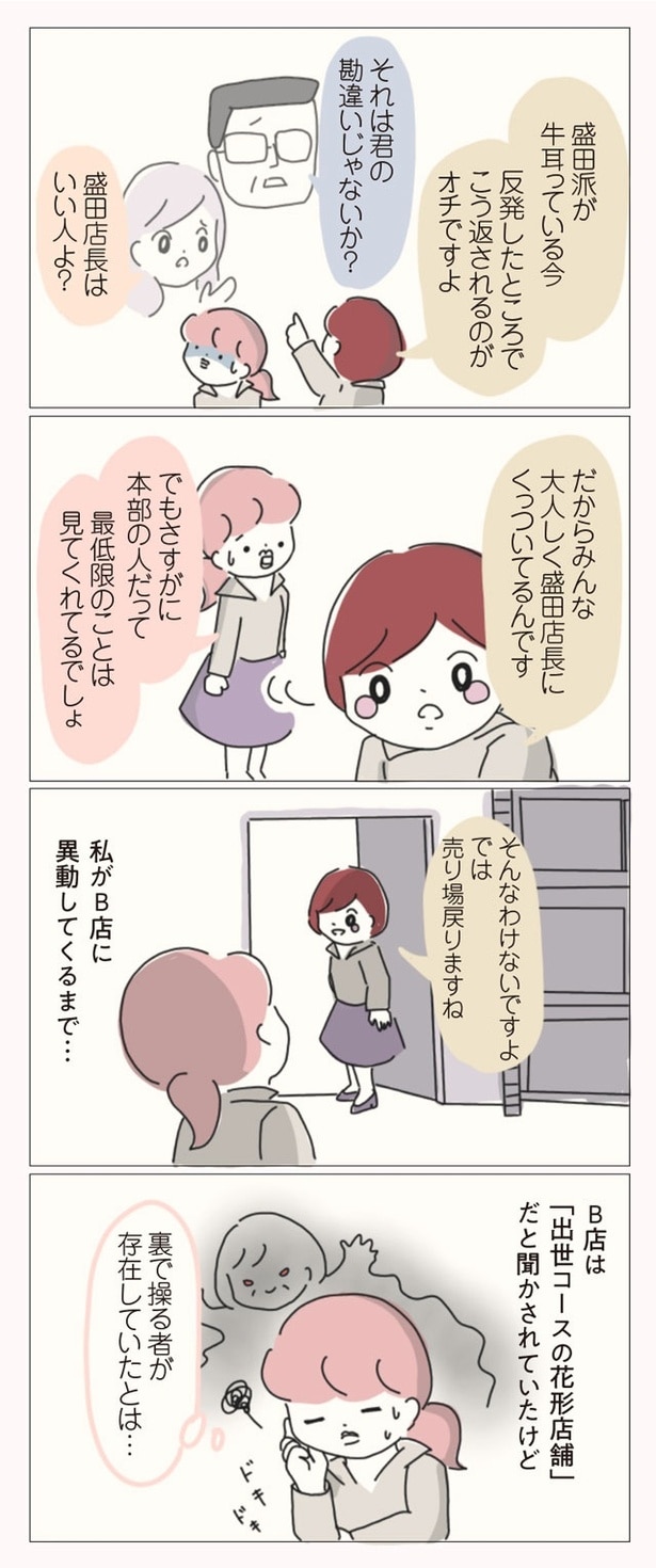 子ども服ブランドでショップ店員をしているぼのこは、数ある店舗の中でも花形のB店へ異動が決まった。B店は花形と言われる一方で、昔からの派閥争いが有名。新人や異動してきたスタッフがすぐに退職してしまうという疑惑があるのだった。緊張の中、異動初日を迎えたぼのこは、早速、店長やスタッフたちから理不尽な思いを受ける。ねちねちマウンティングや悪口に陰口、過剰な先輩優先システムなど…。やがて心身ともに疲弊したぼのこは、この店舗に誰一人味方がいないことを確信。お店の悪しき風習を断ち、スタッフたちに「復讐」するため、ぼのこは店長を目指すことを決意するのだった――。