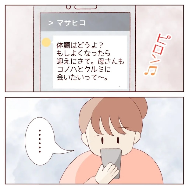 しばらくすると、マサヒコから「体調はどうよ?もしよくなったら迎えにきて。母さんもコノハとクルミに会いたいって~」とメッセージが届きました。私がどれだけ大変だったのかも知らずに・・。子ども達とも一緒に寝てあげられず寂しい思いをさせてしまったのに。マサヒコの調子のいいメッセージに私はモヤモヤ。