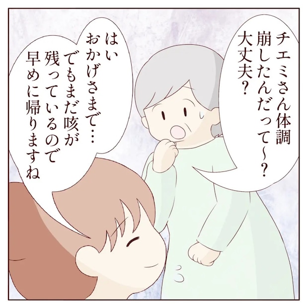 義実家に行くと、義母が「チエミさん、体調崩したんだって~?大丈夫?」と心配そうに聞いてきたので、「はい、おかげさまで・・。でもまだ席が残っているので早めに帰りますね」と伝えました。