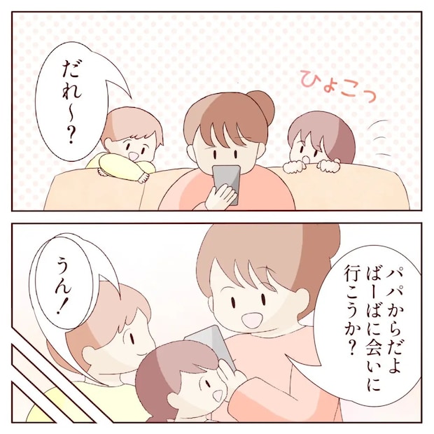 スマホの画面を見つめたままなかなか返信できずにいると、子ども達が「だれ~?」と聞いてきました。「パパからだよ。ばーばに会いに行こうか?」と言うと、子ども達は嬉しそうに「うん!」と言いました。