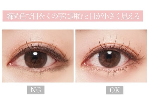 濃い締め色で目尻をくの字に囲んでしまうと、目の横幅が狭く見えることで、全体的な目の大きさも小さく見えてしまいます。
