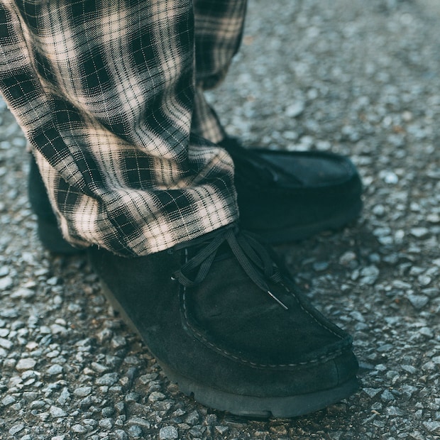 『クラークス』のブラックシューズでコーデを落ち着かせて。チェック柄ボトムスとスウェードで、冬らしさ満点な足元に昇華!