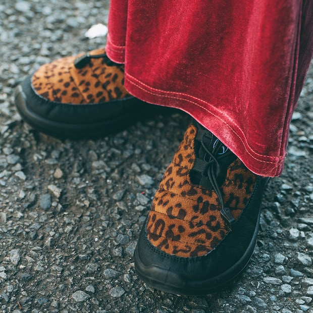 足元はスパイシーなレオパード柄スリッポンをオン!キルティングとドローコードが、装いにスポーティさを添えてくれる一足。