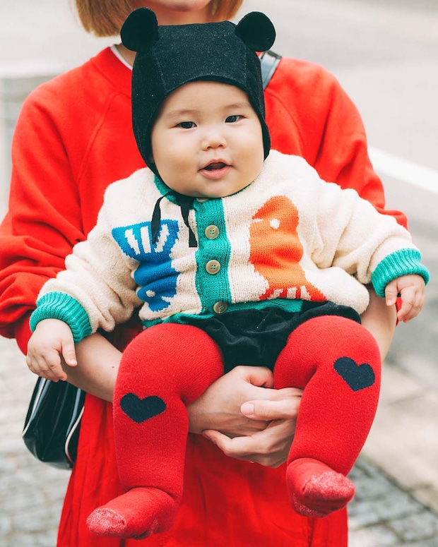ミッキーマウスのような耳付きボンネットをちょこんとかぶって、ご満悦なるいくん。お魚モチーフが目を引くユニークなニットカーディガンを主役に、真っ赤なタイツで元気いっぱいのアクセントをオン。もこもこニットカーディガンがシーズンムードを高め、思わず笑顔になっちゃう愛らしさ全開コーデ。