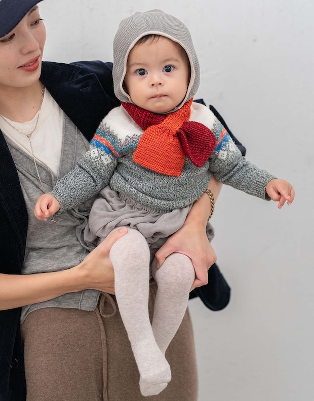 背筋をピンッと伸ばしたまま、ママに抱っこされる姿がとってもお上品なキナリちゃん。冬ならではのノルディック柄ニットに、ボトムとボンネットをグレーで統一して、やわらかなワントーンに。仕上げに、オレンジ×赤のバイカラーストールをひと巻きすることで、パッと華やぐ冬のおしゃれコーデが完成。