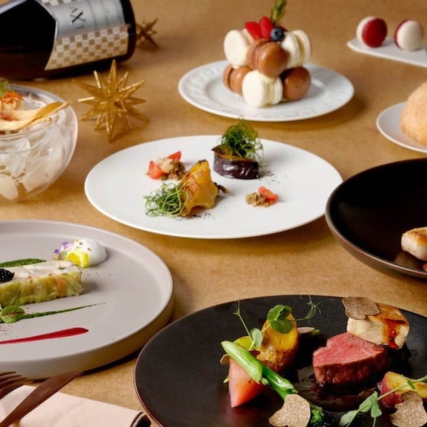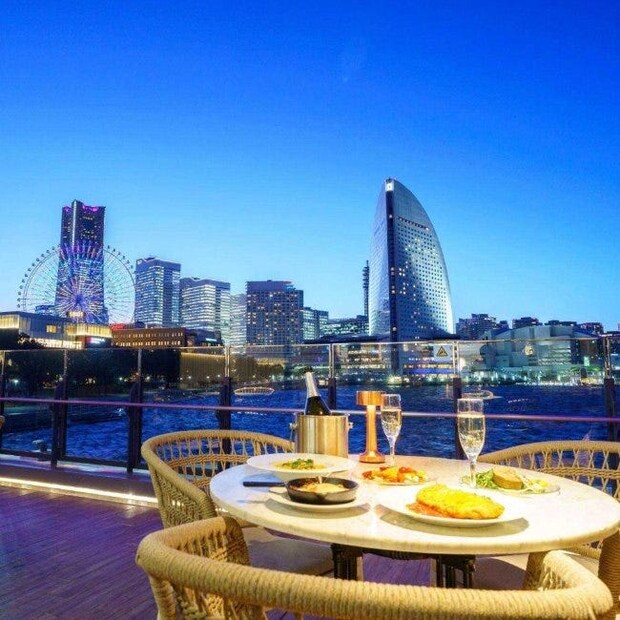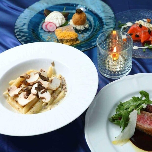 開放的なテラス席では海の気配を感じながら、夕方はサンセット、夜はみなとみらいの迫力ある夜景へと景色が変わっていく絶景ダイニング。クリスマスコースは前菜盛り合わせからスタートし、トリュフ香るクリームパスタ、メインは牛サーロインのローストなど全6皿。チーズの食べ比べやパティシエ特製チーズケーキなど、“ここならでは”の楽しみも。リラックスして過ごしたいデートに。