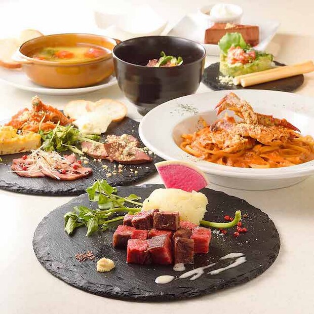 牛タンと牛レバーのやかない肉のカルパッチョも入ったTAPAS5種盛り/甘エビとアボカドのタルタル仕立て/とろけるモッツァレラのアヒージョ/PASTA(渡り蟹のトマトクリームリングイネor静岡県産しらすとバジルのレモンクリーム)/やかない黒毛和牛のサイコロステーキ/牡蠣の旨みとやかない和牛サーロインの茶漬け風リゾット/DOLCE