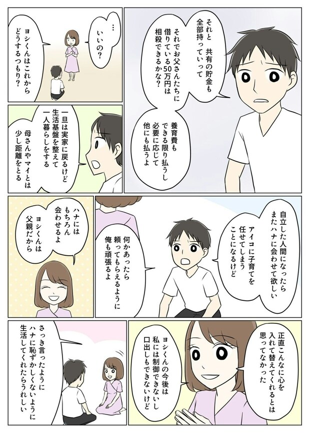 アイコの父とヨシが別室に行き、2人きりで話をすること2時間…。ヨシは戻ってくるなり、アイコに土下座して謝り、これまで夫婦でいてくれたことに感謝の気持ちを伝えました。そして、お金や家族に関する考え方が間違っていたことにようやく気付いたと話します。アイコがこれまで何度も話してきたことでしたが、アイコの父に改めて話をされようやく気付いてくれたようです。