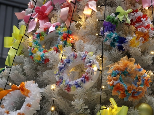 フライト・オブ・ドリームズ、フライトパークの「願いのツリー」には、地域企業や空港事業者が不要な洋服の端切れを再利用して作成したクリスマスリースが飾られている。