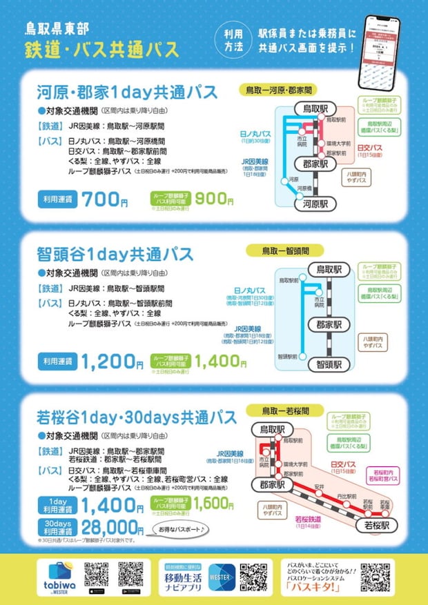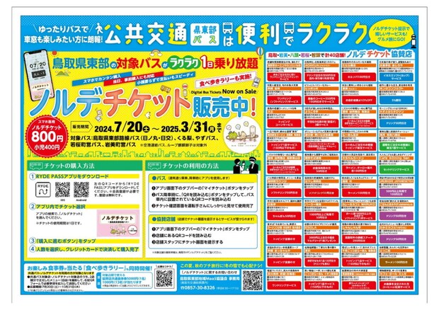 また、鳥取県東部の対象バスが1日乗り放題になる電子チケット「ノルデチケット」も販売中です!(共通パス同様に飲食店舗特典有り!)