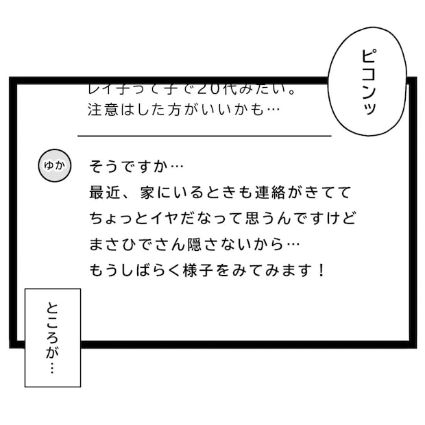 すると、すぐにゆかちゃんから返信がきました。実は、最近は家にいるときも連絡が来ていて、嫌な気持ちになっていたそう。しかも、まさひではレイ子さんとのやり取りを隠す様子もなく、家でも平然と電話に出ているようです。言いたいことは山ほどありましたが、ひとまず今はお互いに様子を見ることにしました。