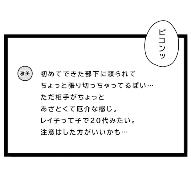 初めてできた部下をかわいがりたい気持ちはわかりますが、「男として何とかしてあげたい」という考え方は完全にお門違いです。部下に頼られたいのなら、上司として「仕事の範囲」だけで十分なはず。それなのに、レイ子さんと連絡を取る理由を正当化したりして・・・雅美さんもゆかさんも、注意深く見守る必要がありそうですね。