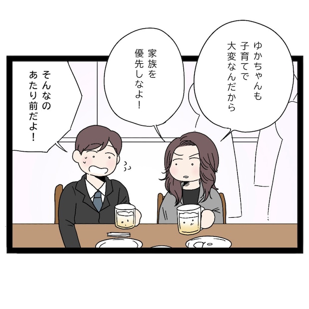 「ゆかちゃんも子育てで大変なんだから、家族を優先しなよ!」浮かれているまさひでに、私は釘を刺すように言いました。するとまさひでは慌てて「そんなのあたり前だよ!」と否定しますが、その言葉をどこまで信じていいのか・・・正直怪しいところです。ひとまず私は、まさひでを泳がせることにしました。