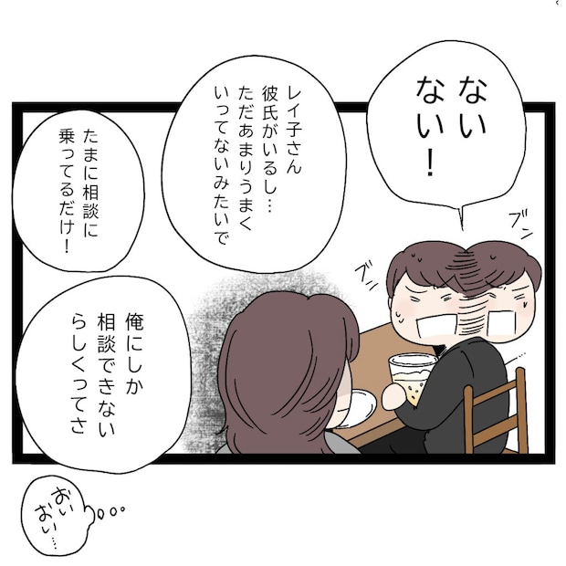 まさひでは「ないない!」と大きく首を振って必死に否定します。「レイ子さん彼氏がいるし、ただあまりうまくいってないみたいで」「たまに相談に乗ってるだけ」「俺にしか相談できないらしくって」私に浮気を疑われていると思ったのか、まさひではレイ子さんとの関係を正当化するように、彼女と連絡を取る理由を次々と並べました。