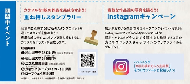 さらに、展示作品の写真をInstagramに指定ハッシュタグ「#松山城おもしろ芸術祭」を付けて投稿すると、抽選で50名にネゴシックスさんデザインのクリアファイルが当たるプレゼントキャンペーンにも参加できます。