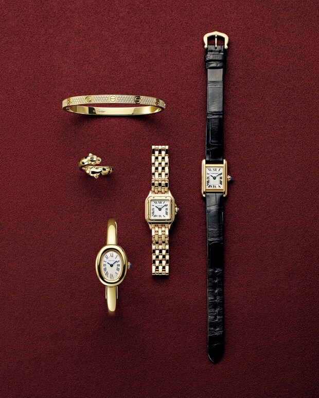 三代目当主ルイ・カルティエが、のちにアールデコ様式の先駆けとなるモダンなディテールを取り入れ、自ら愛用したモデルに着想を得た「タンク ルイ カルティエ」。80sマインドが息づくグラマラスな曲線美で、ジュエリーウオッチの殿堂と呼ばれる「パンテール」。ぽってりとしたオーバル型がアンティークを彷彿とさせる「ベニュワール」は、若き日の仏女優カトリーヌ・ドヌーヴの愛用品としても知られる。時計とのマッチングには、キャッチーな風貌で大人の支持率再燃中の「パンテール」リングや「LOVE」ブレスを。