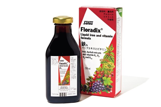 「ドイツ生まれの液体鉄分サプリメント。吸収率が低い鉄分が1日2回、20mLずつ飲むだけでスムーズに摂取できる。フルーティで美味しく、胃腸に負担がかかりにくい」フローラディクス 250mL ¥2,916(フローラ・ハウス)