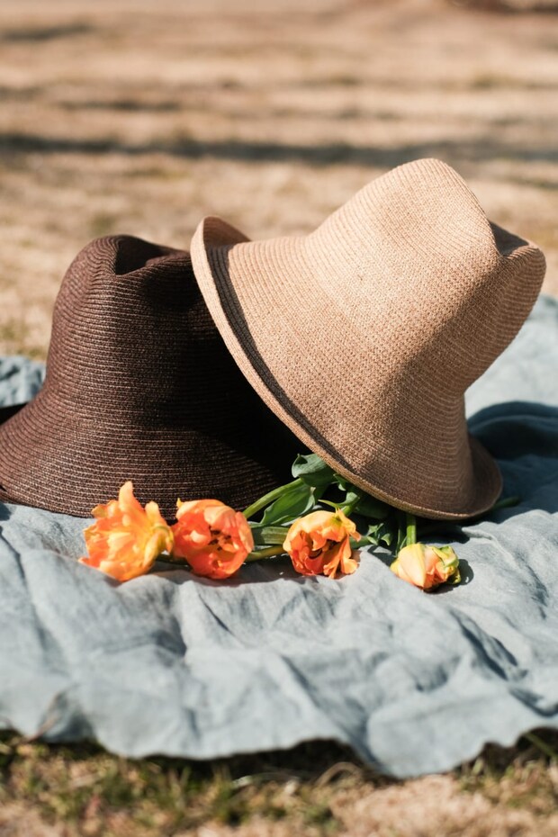 中折れのクラウンにダウンしたつばが絶妙なバランスで、しっかり顔まわりの日差しをよけながらもスマートなイメージになるハット。折り畳めるので、使わないときはバッグにしまえて便利。山中島さんのかぶっているナチュラルとシックなブラウンの2色展開。ハット各¥18,700(共にマリホジャ)