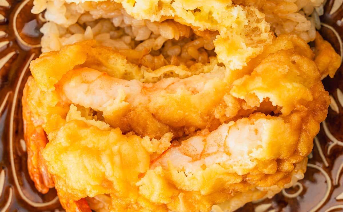 商品名のとおり、海老天丼のようなおにぎりとなっており、ごはんのあいだに尾つき海老天2尾と、甘酢生姜が挟んであります。