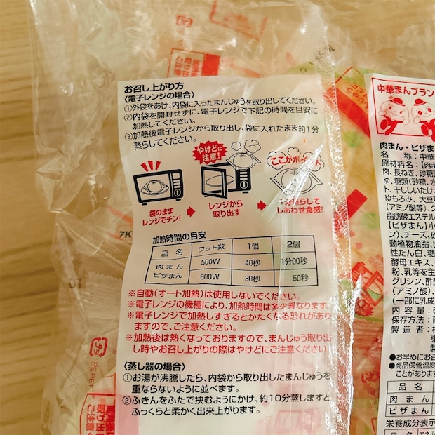 袋の裏に温め方が書いてありますよ。2個の場合は500Wで1分ちょうど。600Wだと50秒。そのあと1分、個包装のまま蒸らします。