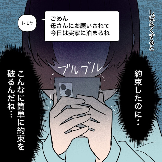 ・・・それなのに、私との約束はあっさり破られました。スマホには、「ごめん、母さんにお願いされて今日は実家に泊まるね」というトモヤからのメッセージが。あれだけ必死に訴えて約束したのに、どうしてこんなに簡単に破るの?スマホを握る手が悔しさで震えました。