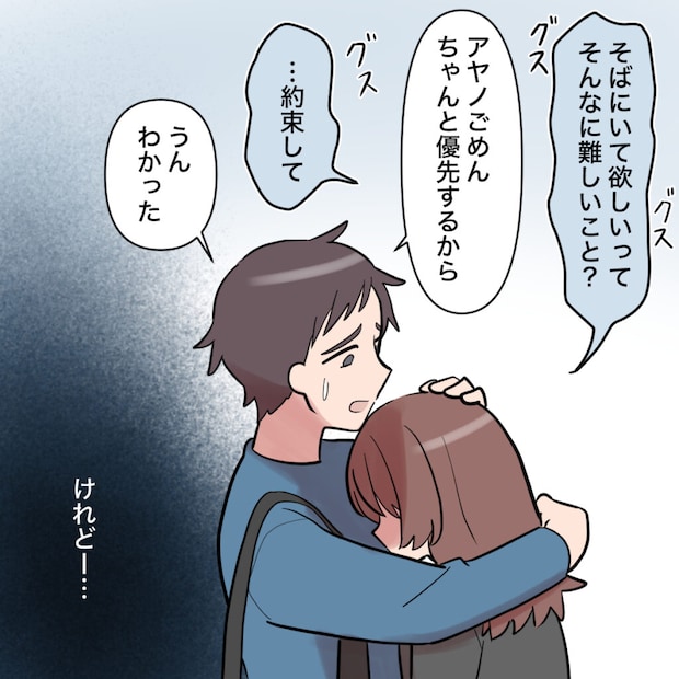 「そばにいて欲しいってそんなに難しいこと?」嗚咽まじりに訴える私をトモヤはそっと抱き寄せ、「アヤノごめん、ちゃんと優先するから」と約束してくれました。ここまで気持ちを伝えたんだから、今度こそ大丈夫。私はもう一度、トモヤを信じることにしました。