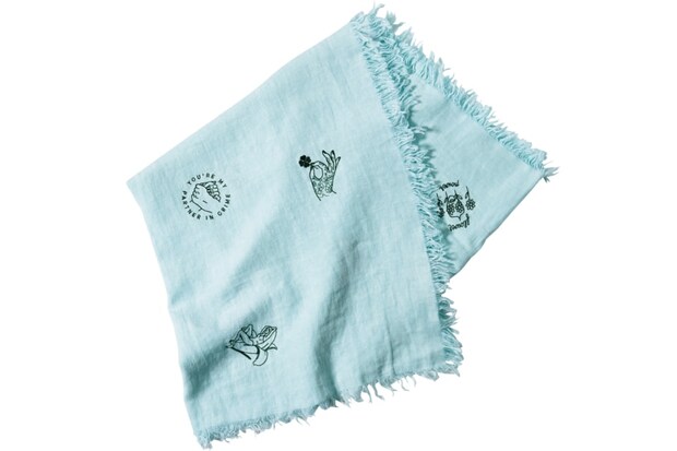 「アソース メレの定番であり、ロンハーマンでも人気のリネンストールをもとにジーン アンドレに依頼した、メッセージが込められた刺繍入りストール」