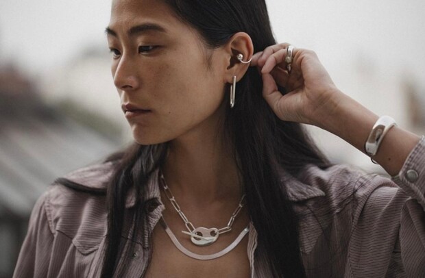 レイヤードしやすいものというと、ついシンプルなジュエリーを求めてしまいがちですが、みんなと足並みを一切揃える気がない(笑)個性的なデザインを1点投入するのも、洒落見えするテクニックのひとつです。分かりやすいモチーフよりも、モダンで有機的なフォルムがいいと思います。