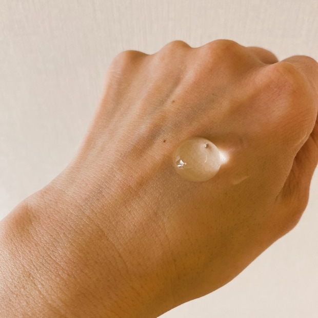 あっという間にこのぷるんぷるんのジェルが水テクスチャーに! 不思議な感覚。肌にのせたとき少しひんやりする感があるので、夏に使うと気持ちいいです。