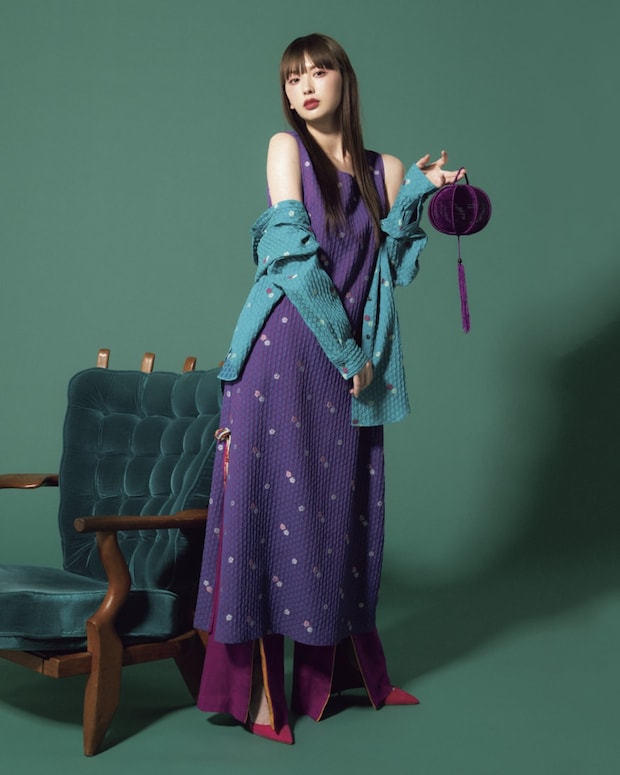 着物に用いられる小紋柄があしらわれたブラウスとドレスは、どこかモダンな印象。質感の異なる鮮やかなパンツをレイヤードすれば妖艶で大人っぽいムードに。凹凸のある表情豊かな素材やスリットにほどこされた飾り紐など、細部までこだわりがたっぷり。
