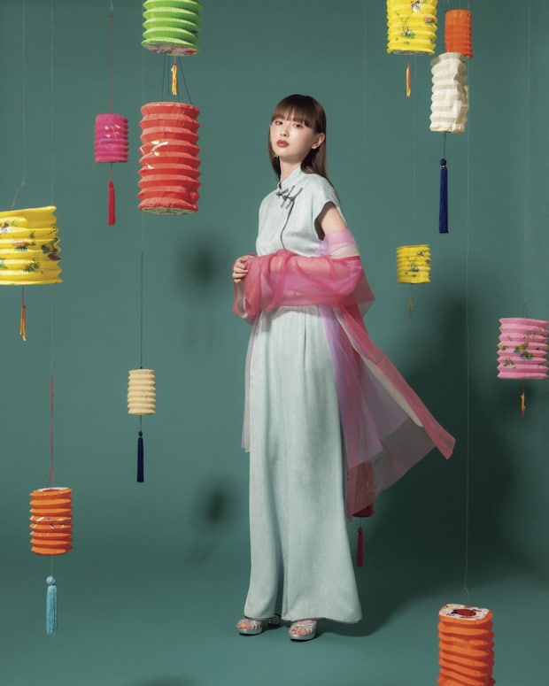 ツヤのある滑らかな生地に花の織模様がさり気なく入ったジャンプスーツは、ワイドなシルエットながら自然な落ち感で上品に着られる。胸元のパイピングとチャイナカラーがエキゾチックムード漂う1着。シアーガウンと合わせれば、まるで天女のよう。