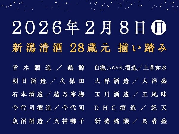 「2026 冬酒まつり」に参加する酒蔵は、青木酒造/朝日酒造/石本酒造/今代司酒造/魚沼酒造/越後酒造場/王紋酒造/尾畑酒造/お福酒造/下越酒造/金升酒造/麒麟山酒造/金鵄盃酒造/小山酒造店/白瀧(しらたき)酒造/大洋酒造/玉川酒造/DHC酒造/新潟銘醸/白龍(はくりゅう)酒造/柏露酒造/福顔酒造/丸山酒造場/峰乃白梅酒造/弥彦酒造/よしかわ杜氏の郷/吉乃川/LAGOON BREWERYとなっている。