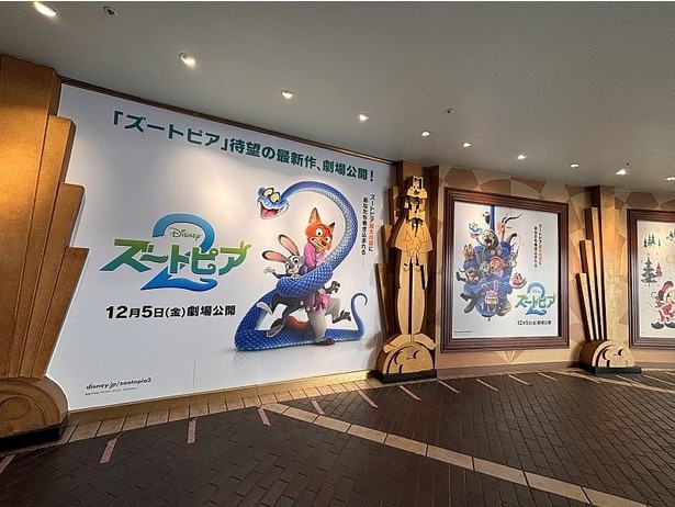 同施設にある映画館シネマイクスピアリでは、入り口サインの「IKSPIARI」の文字が「ZOOTOPIARI」に変化しているのだ。また、その周りには、再びバディを組んだジュディとニック、新キャラクターのヘビのゲイリーの装飾も。