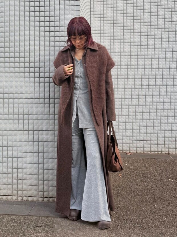 「最近お気に入りのグレー×ブラウンのカラーでまとめました。CONNのウールマキシコートはマイルドなブラウンの色味が気に入っている一枚です。肩にかけているモヘアシルクのストールはマリホジャのもので、肌触りが最高でさらに温かくなって優秀。どちらも仲良しの友人たちが手がけているブランドのものです。中に着ている自身のブランドのベロアセットアップと友人たちのブランドでトータルコーディネートできる幸せに包まれています」