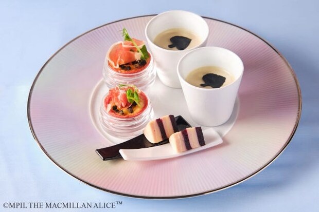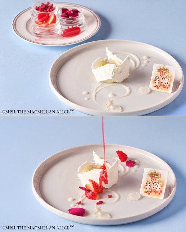 オプションで楽しめるスペシャルデザート「ペイント ザ ローズ」も必見。可憐な白い薔薇のムースを、自身で赤いラズベリーのソースやフレッシュいちご、ベリー、赤い薔薇で飾り付けて情熱的な赤い薔薇に変身させる特別な1皿に。物語の白薔薇から赤薔薇へ塗り替えるワンシーンを表現した1品は目でも舌でも楽しめ、動画撮影も必至。