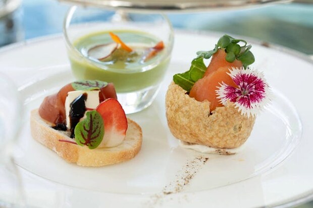 3段目は、全体を通していちごのうまみをよりいっそう引き立てる構成に。バルサミコと生ハムを組み合わせたいちごの甘み際立つオープンサンドに加え、サクサク食感のパニプリに包まれたスモークサーモンとポテトサラダ、コンソメジュレと合わせられた軽やかな口当たりのグリーンピースのムースリーヌなどがラインナップ。