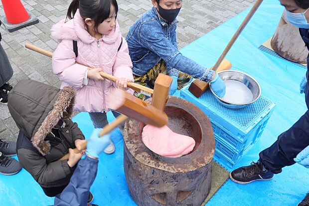 伝統のもちつき体験と紅白餅のふるまい
