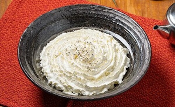 白いクリームが特徴で、クリームの下にはチーズ、明太子などが隠れており、混ぜて食べると美味しい。だしを加えて味の変化を楽しむこともできる。