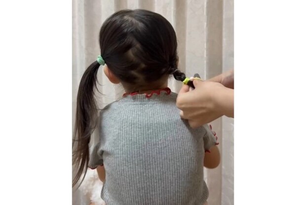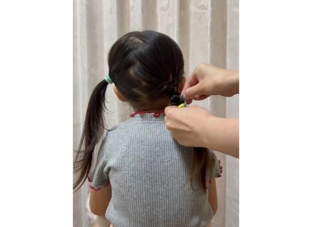 3~4cmくらい、だいたい3回くらい編んだらゴムで結びましょう。このとき蛍光のゴムを使えば、遠くからも見つけやすく、子どもも気に入ってくれる髪型になります♪