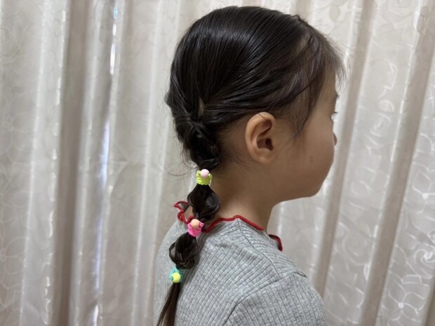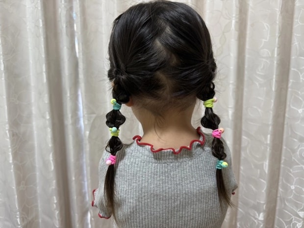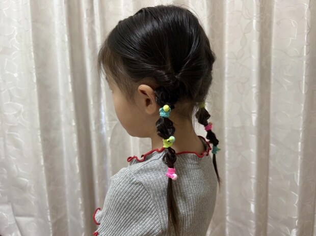 毛束を何か所もゴムで留めているので、崩れにくくていいんです!帽子の邪魔にもならないし、不快感もなさそうでした。蛍光のゴムで見つけやすいし、華やかでかわいいから、子どもも気分上がってくれて頑張ってくれますよ♡
