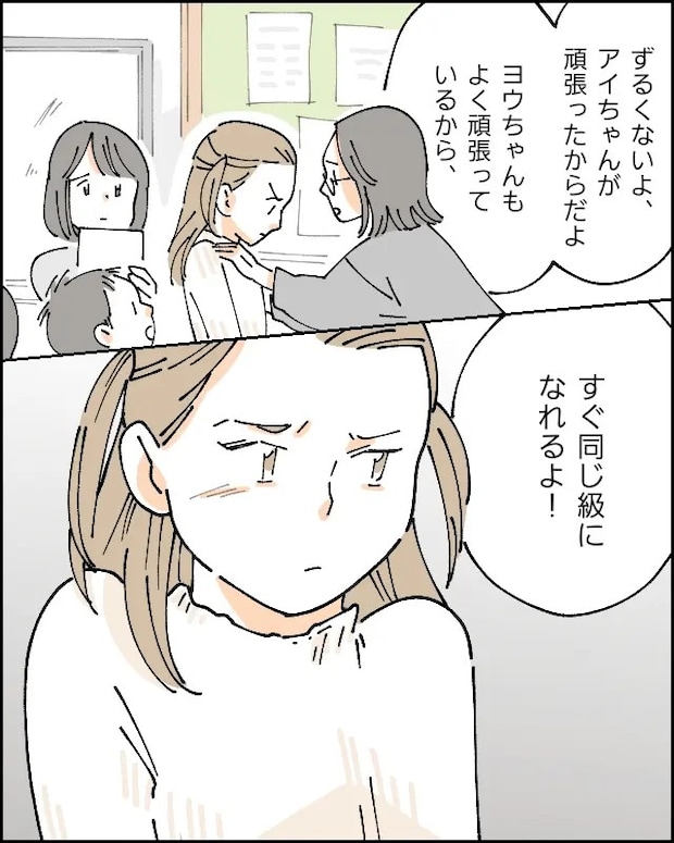 「ずるくないよ、アイちゃんが頑張ったからだよ。ヨウちゃんもよく頑張っているから、すぐ同じ級になれるよ!」と怒り出すヨウちゃんを先生がなだめていたのでした。