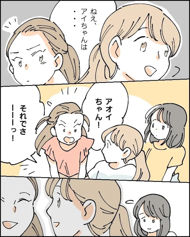 さらに、「ねえ、アイちゃんは・・」とアオイちゃんが振り向いてアイに話しかけようとすると、「アオイちゃん!それでさーーーっ!」と割り込んで声をかけるヨウちゃん。当然アオイちゃんはヨウちゃんの話を聞くことになりアイはぽつんと1人のままでした。
