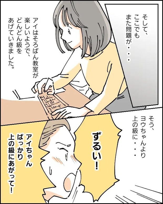 アイはそろばん教室が楽しいようで、どんどん級をあげていきました。そう・・ヨウちゃんより上の級に。すると、「ずるい!アイちゃんばっかり上の級にあがって!」と怒り出すヨウちゃんに、