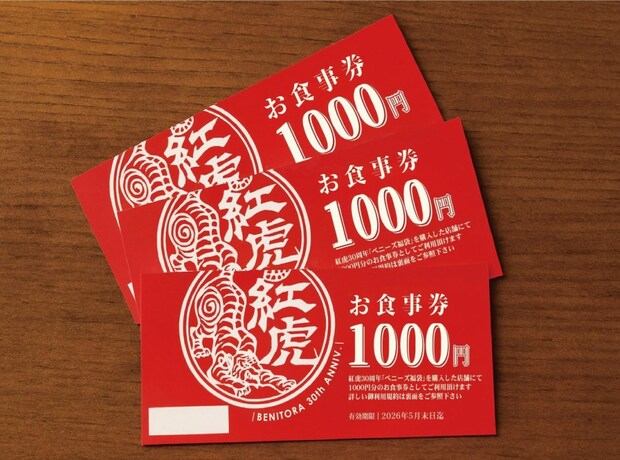 一部店舗を除く全国の「紅虎餃子房」で使える食事券(1,000円分×3枚)。当日から1会計につき1枚まで利用できる。有効期限は2026年5月末まで。