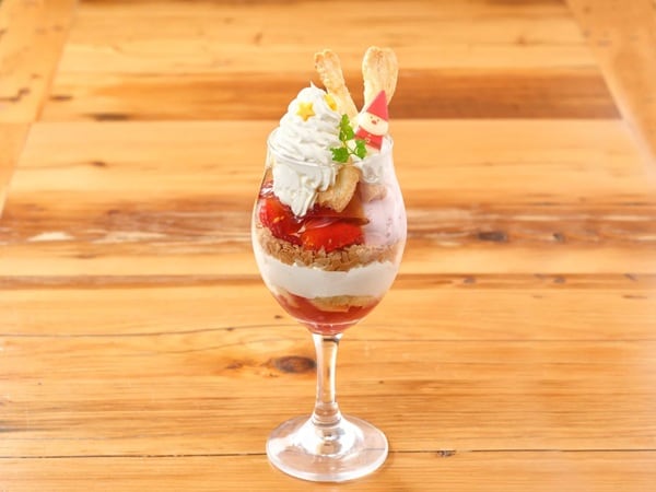 「ストロベリー クリスマスパフェ」単品1,280円(税込)/ドリンク付き1,580円(税込)は、みずみずしい“いちご”を主役に紅茶ジュレのすっきりした香り、シナモンやナツメグ香る洋梨のコンポートなど、甘さの中に上品な余韻が残る大人の味わい。フィアンティーヌのサクサク食感や、添えたパイをディップして楽しむ遊び心など、層ごとに表情が変わる“ときめき”が詰まっている。