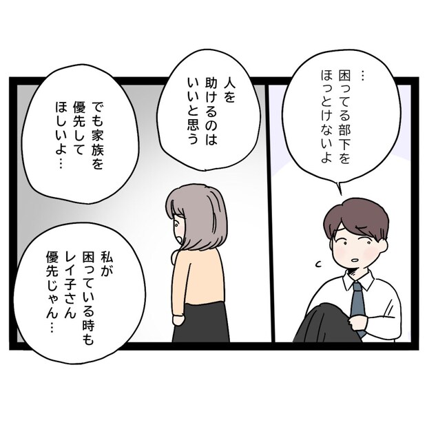 困っている人を助けたいという気持ちは理解できます。けれどレイ子さんはあくまで他人であり、家族より優先すべき存在ではありません。まさひでさんは「家族」と「職場の部下」を同じラインに置き、そのうえで「1人で悩んでいるレイ子さん」を優先してしまいました。家族は人生を共にする大切な存在。職場の人を同列に扱うのは、明らかに基準がずれていますよね。