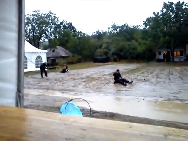 動画は「Two Drunk guys going home」というタイトルで、ぬかるんだどろどろの道が舞台。まずは画面の左側から歩いてきた男性が滑って転んでしまい、地面できれいな大の字に。