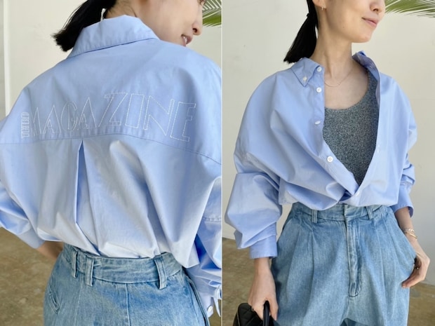 「スタイリスト安西こずえさんと作ったミコモリとのコラボシャツ。こなれ感の出るオーバーサイズ、バックのロゴ刺繍がさり気ないアクセントに。旬でもある爽やかなブルー、少しハリ感のある素材使いでシャツならではの凛とした魅力を引き出しています。シャツとしてはもちろん、端境期の軽い羽織りとしてもユースフルな1枚です」バックエンブロイダリーシャツ¥29,700(サードマガジン×ミコモリ/サードマガジン)
